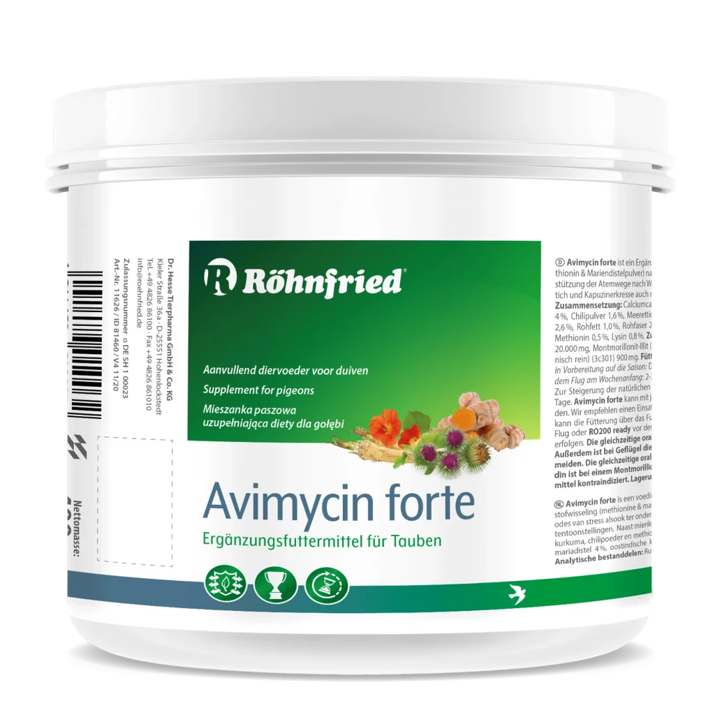 Avimycin forte, hastalık ve stres dönemlerinden sonra metabolizmayı desteklemek ve rahatlatmak (metiyonin ve deve dikeni tozu) ve yarış ve gösterilerden sonra solunum yollarını desteklemek için kullanılan bir takviyedir. Yaban turpu ve turp otunun yanı sıra deve dikeni, zerdeçal, acı biber tozu ve metiyonin de içerir.