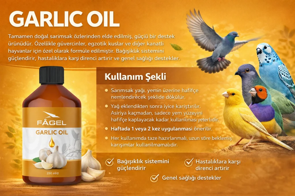 Garlic Oil is a strong supplement product obtained from natural garlic essence. It is specially formulated for doves, exotic birds and other winged animals. It strengthens the digestive system, increases the immune system against diseases and supports the general health of the bird.