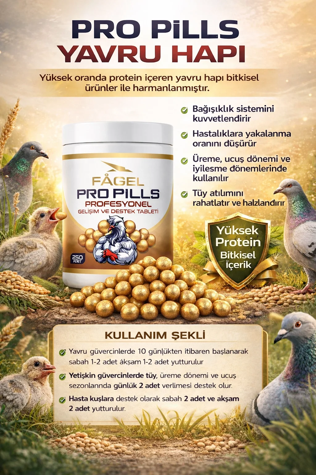 Pro Pills, Özellikle yavru güvercinlerin gelişimini sağlıklı tamamlamasına yardımcı olmak ve takviye ihtiyacı olan güvercinlere destek amacı ile üretilmiştir.